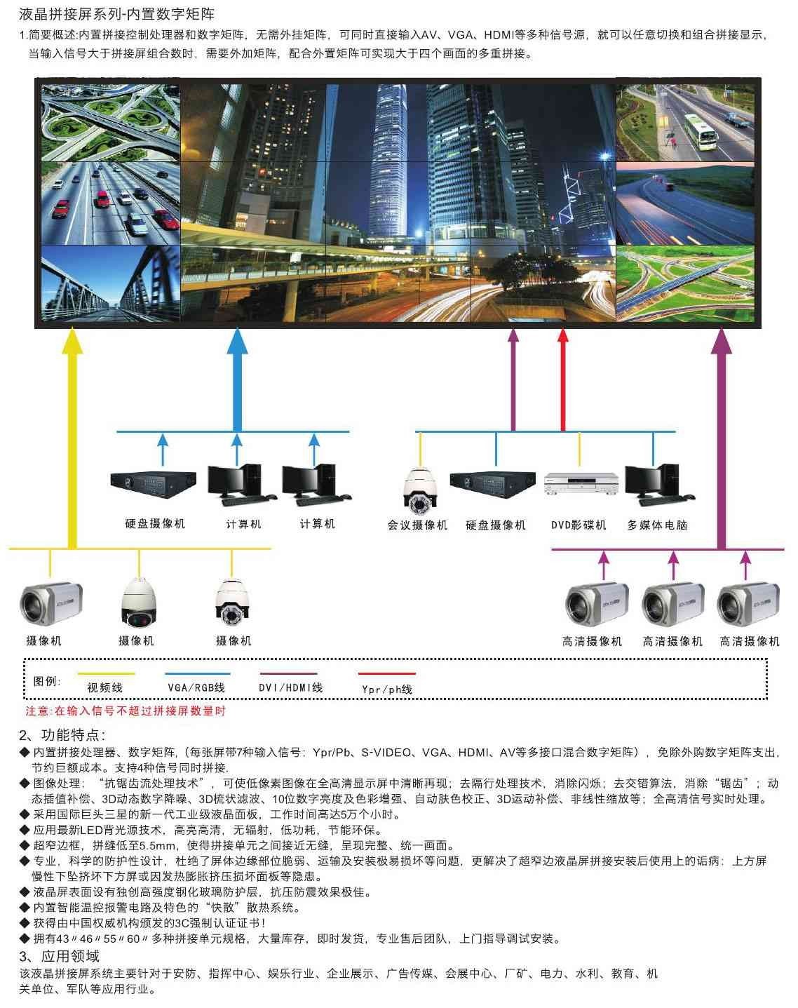 電視臺(tái)演播廳、氣象臺(tái)、火車站、機(jī)場(chǎng)、娛樂(lè)傳媒、軍隊(duì)作戰(zhàn)指揮中心、交通指揮系統(tǒng)、公安110指揮系統(tǒng)、電力調(diào)度、防汛調(diào)度、購(gòu)物中心、銀行等行業(yè)的應(yīng)用中發(fā)揮重要的作用。