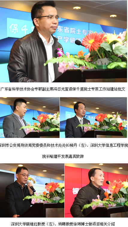 隨后,廣東省科學(xué)技術(shù)協(xié)會專職副主席馮日光宣讀保千里院士專家工作站建站批文。深圳市公安局刑偵局黨委委員和技術(shù)處處長柳丹、深圳大學(xué)信息工程學(xué)院院長喻建平作為嘉賓代表致辭,三位領(lǐng)導(dǎo)均對此次產(chǎn)學(xué)研合作的意義及深遠(yuǎn)影響表達了高度肯定,對項目前景表達了美好展望。
