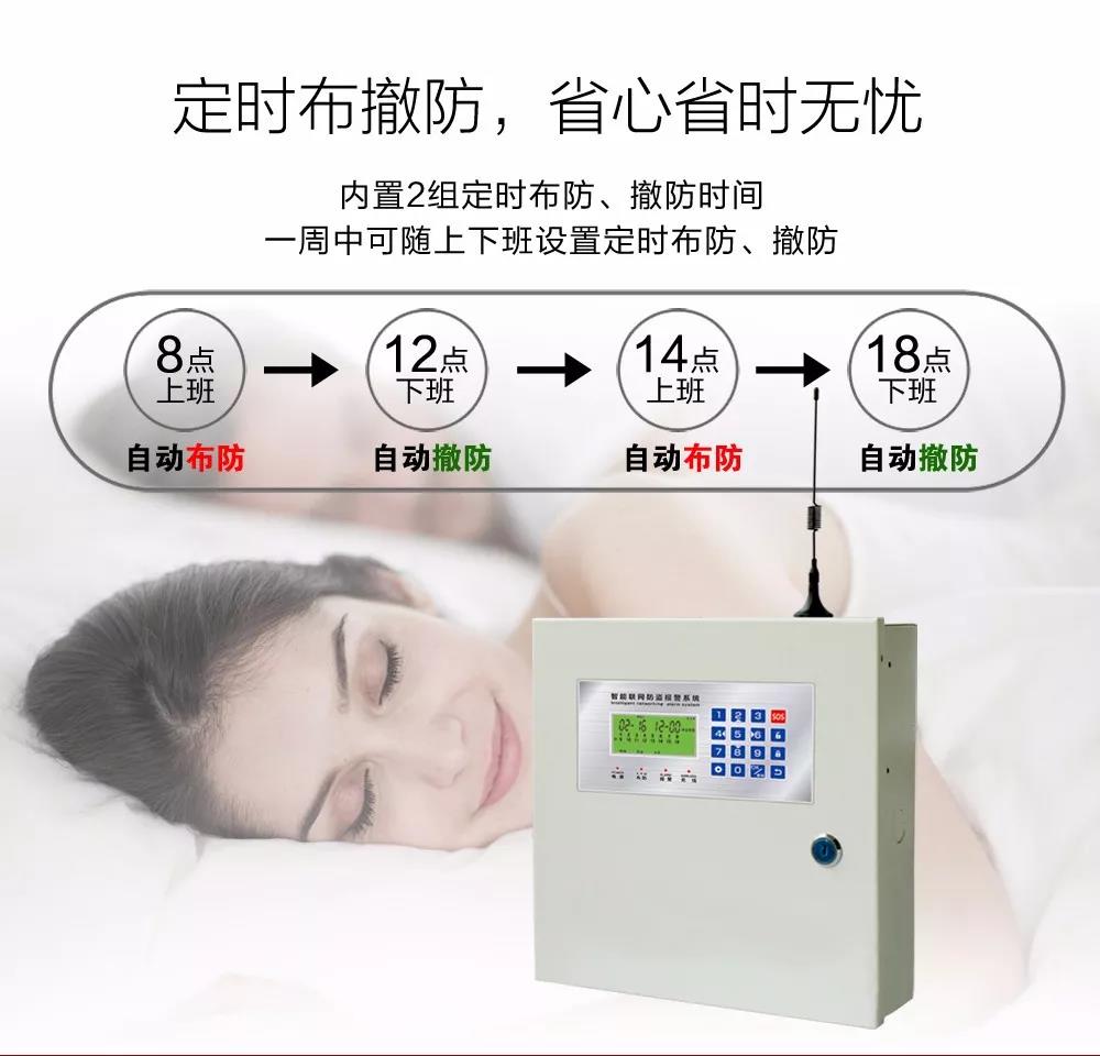 ◆ 兩組定時布防、撤防時間,一周中可隨上下班時間設(shè)置定時布、撤防;