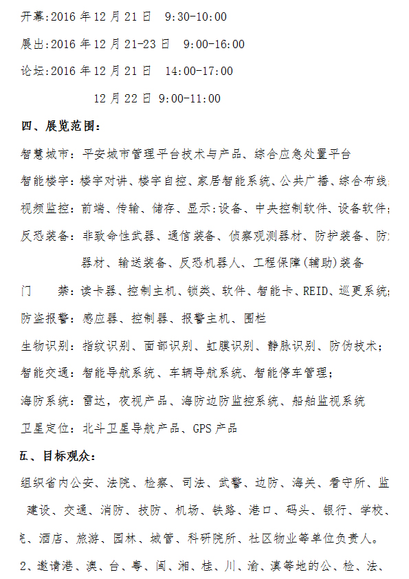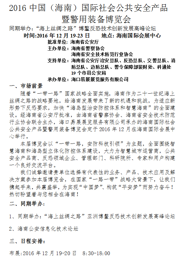 摘要:隨著“一帶一路”國家戰(zhàn)略全面實(shí)施,海南作為二十一世紀(jì)海上絲綢之路的戰(zhàn)略要地,給海南發(fā)展帶來了新的機(jī)遇和挑戰(zhàn),為適應(yīng)新形勢下反恐要求,加快“海島型治安防控體系和智慧海南”的全面建設(shè)。經(jīng)海南省公安廳批準(zhǔn),由海南省警察協(xié)會、海南省安全技術(shù)防范行業(yè)協(xié)會聯(lián)合主辦,�?谝渍拐褂[服務(wù)有限公司承辦的海南國際社會公共安全產(chǎn)品暨警用裝備博覽會定于2016年12月在海南國際會展中心舉行。