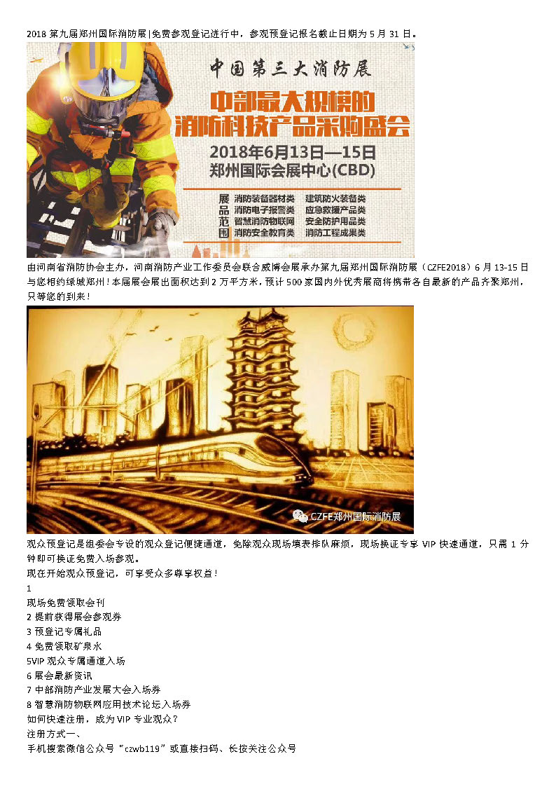 2018第九屆鄭州國際消防展|免費參觀登記進行中,參觀預登記報名截止日期為5月31日。